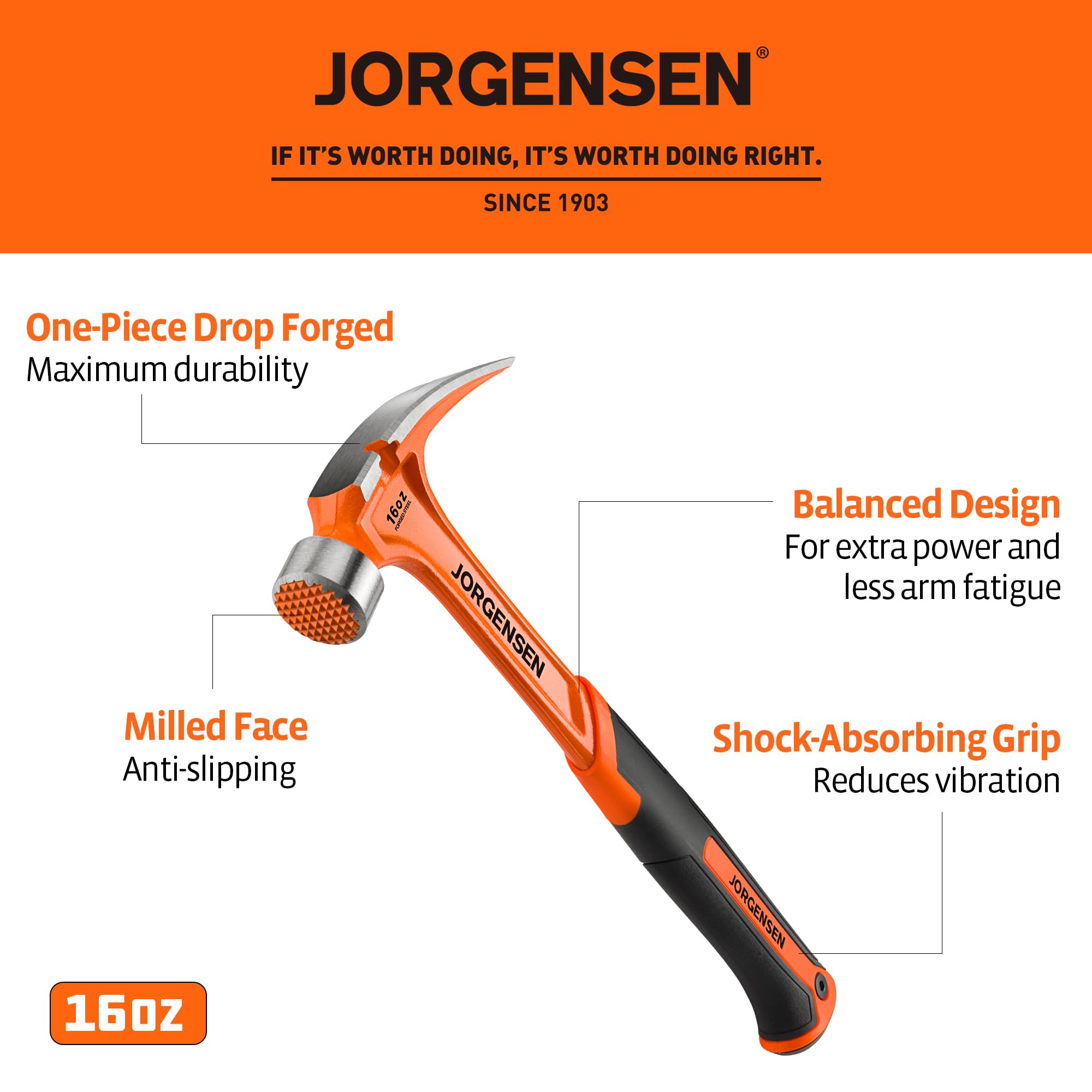Jorgensen 16 oz Straight Claw Hammer, Rip Claw Hammer with Milled Face & Shock Absorbing Grip, Heavy Duty One-piece Forged Hammer